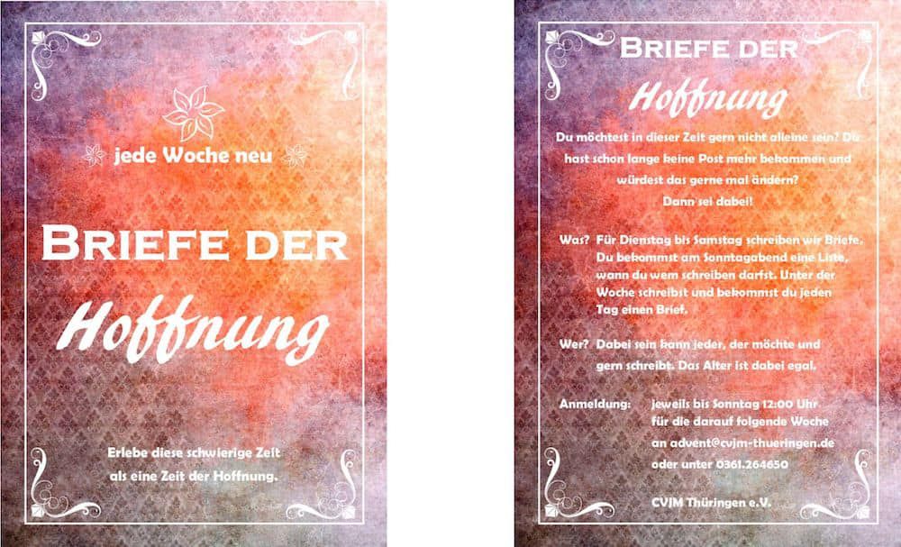 Du möchtest in dieser Zeit nicht alleine sein? Du hast schon lange keine Post mehr bekommen und willst das ändern? Dann sei dabei! Ab nächster Woche starten wir eine neue Aktion: die Briefe der Hoffnung. Anmelden könnt ihr euch mit Name, Post- und E-Mail Adresse unter Diese E-Mail-Adresse ist vor Spambots geschützt! Zur Anzeige muss JavaScript eingeschaltet sein. oder direkt im Landesverband unter 0361-264650. Die Anmeldung endet jeweils am Sonntagmittag und ihr erhaltet am Sonntagabend eine Liste für die kommende Woche, wann ihr wem schreiben dürft. Dadurch bekommt auch ihr von Dienstag bis Samstag jeweils einen Brief. Am Sonntag startet die Aktion dann wieder neu. Wir wollen in dieser Zeit wieder mehr Gemeinschaft stiften, mehr Leute an unserem eigenen Leben teilhaben lassen und mehr Hoffnung verbreiten. Sei auch du dabei! Für eine Woche oder für mehrere - wie es dir passt. Wir freuen uns auf dich!
